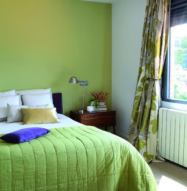 Xanh lá cũng là màu sắc mát mẻ và thư giãn. Sự phối hợp những sắc độ xanh khác nhau của các bức tường trong phòng ngủ với rèm cửa họa tiết cây lá xanh cùng ga trải giường và nội thất màu trắng đã mang đến sự thư giãn trong phòng ngủ. Gam màu này thích hợp để trang trí cho cả phòng trẻ em lẫn người lớn.