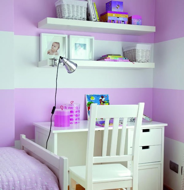 Màu sơn là một ý tưởng hấp dẫn để làm điểm nhấn trong phòng của trẻ. Không nhất thiết bạn phải sơn một màu cho tất cả các bức tường. Hãy kết hợp linh hoạt và sáng tạo nhiều gam màu khác nhau để căn phòng trở nên mới mẻ và hấp dẫn hơn. Bức tường màu sắc đan xen giữa màu hồng tím và kem cùng với những đồ nội thất màu trắng sẽ là một ý tưởng thú vị cho phòng ngủ của công chúa nhỏ nhà bạn.