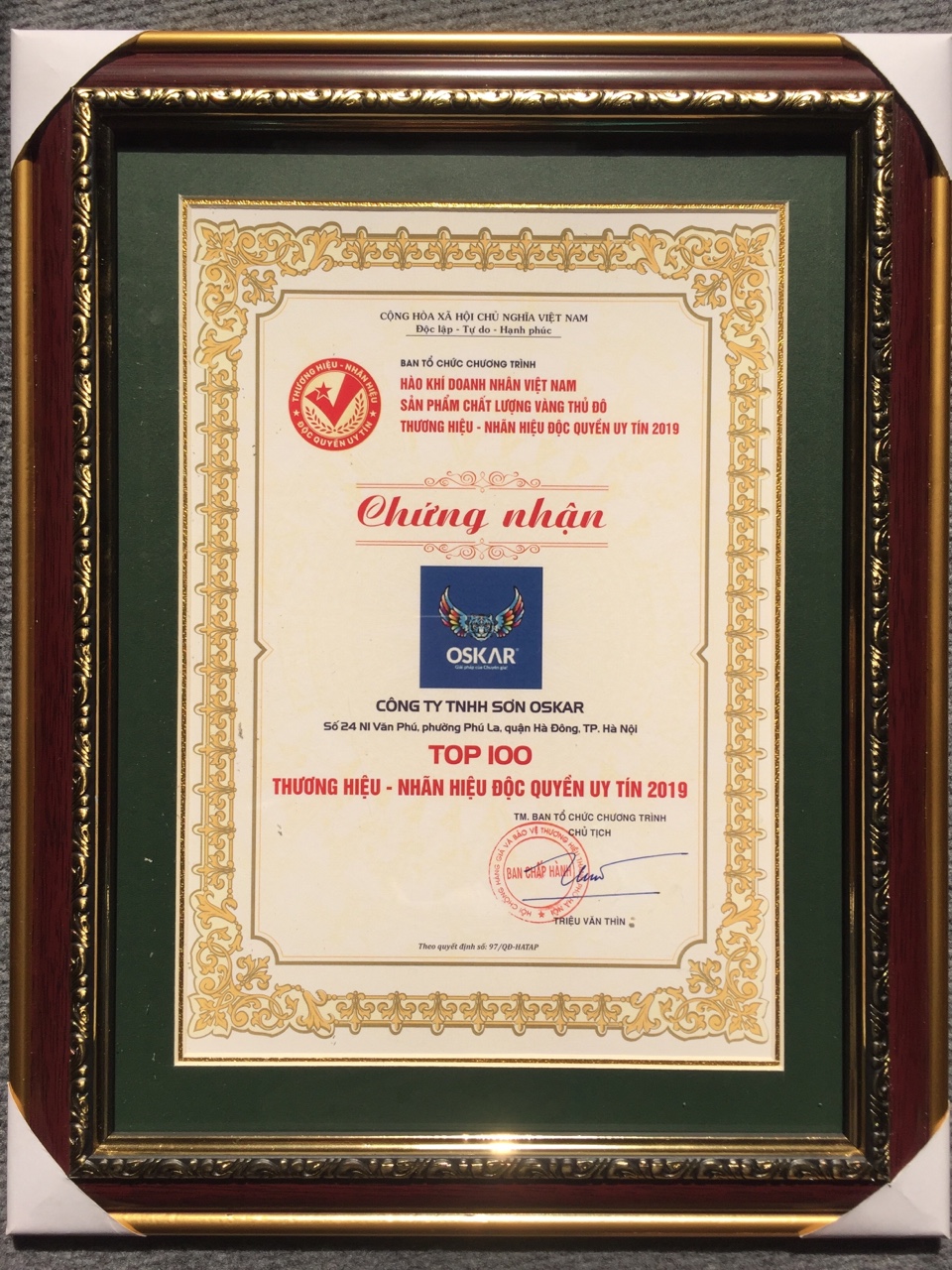 Nhờ sự nỗ lực trong suốt thời gian qua, Công ty TNHH sơn Oskar đã vinh dự đạt giải thưởng Top 100 thương hiệu, nhãn hiệu độc quyền uy tín 2019.