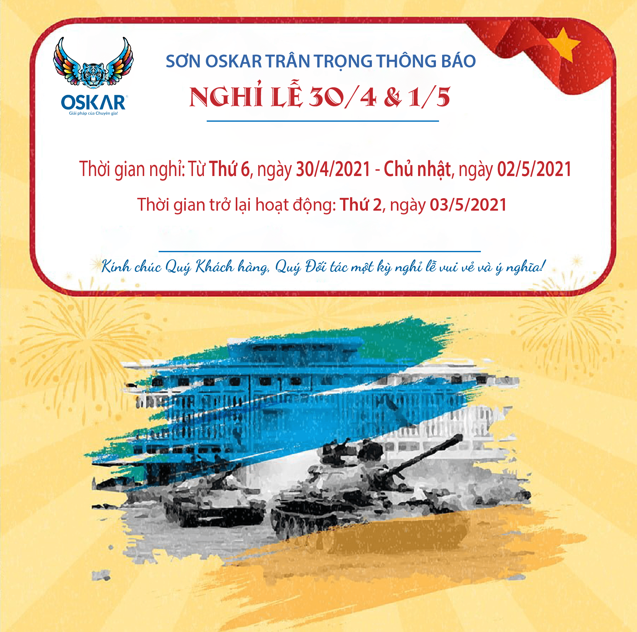 Chào mừng ngày Giải phóng miền Nam 30/04 và Quốc tế lao động 01/05, Sơn OSKAR xin thông báo đến Quý khách hàng lịch nghỉ lễ của công ty.